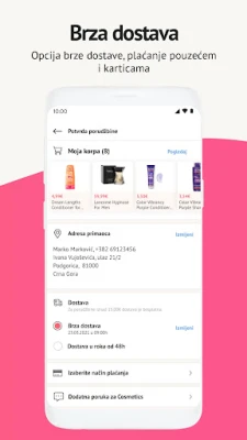 Kupovinu preko aplikacije obavljate dodavanjem artikala u korpu, a na raspolaganju su, u zavisnosti od raspoloživosti i mjesta isporuke, brza i dostava u roku od 48h. Plaćanje odabrane korpe možete obaviti na dva načina: pouzećem ili platnom karticom. Na jednom korisničkom nalogu možete, ukoliko želite, formirati listu adresa za dostavu i listu platnih kartica, i upravljati tim listama po sopstvenom izboru. Aplikacija ima mogućnost praćenja statusa narudžbine, i listu svih realizovanih kupovina.