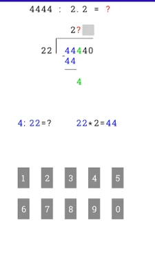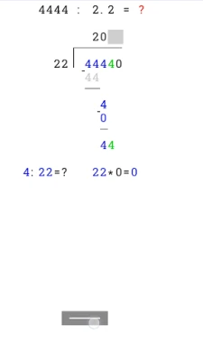 The program is designed to study the arithmetic operation of division of two decimals only visually without words. Three methods of teaching are used: 1. independently - the student, 2. program - the teacher, 3. together with the program - the teacher and the student. All actions in the program occur without words, intuitively clear and understandable. In the process of solving problems and when entering data, hints are used to help.